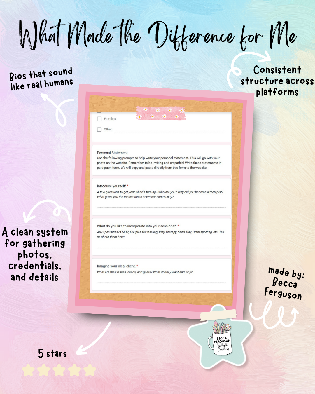 This form ensures that you have everything you need to introduce your new therapist online with ease. It’s perfect for creating professional, consistent profiles that highlight the strengths of your team on your website and social media.