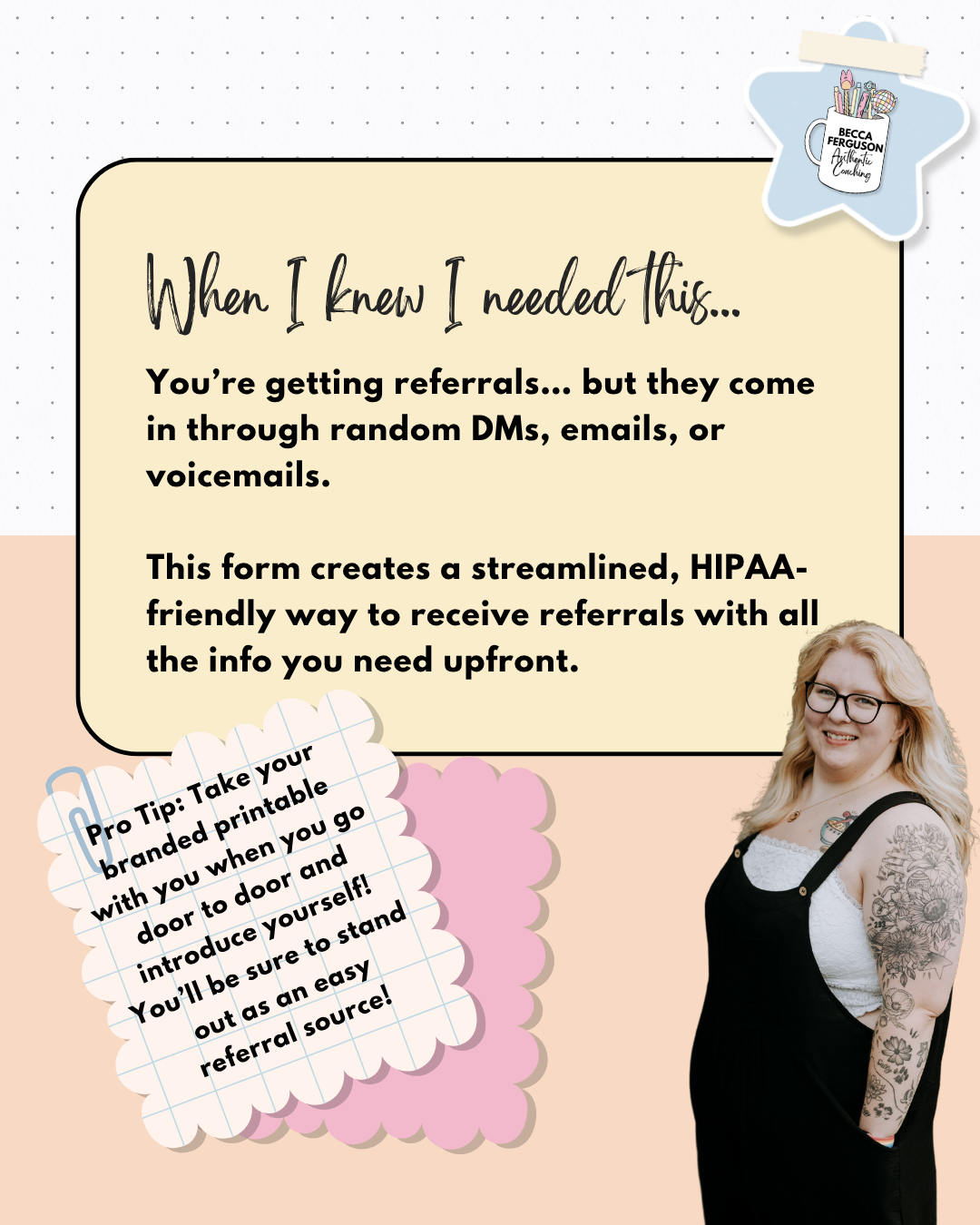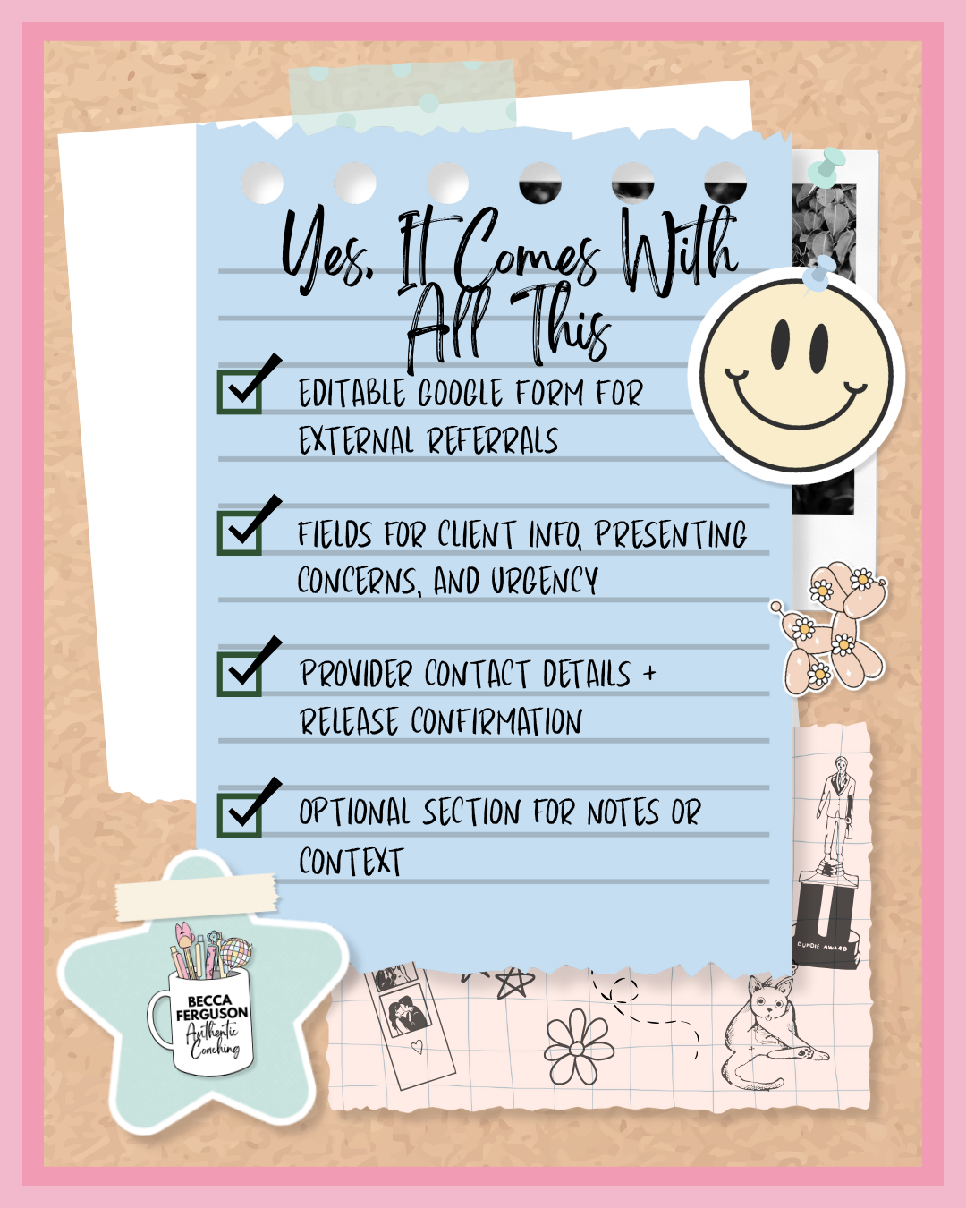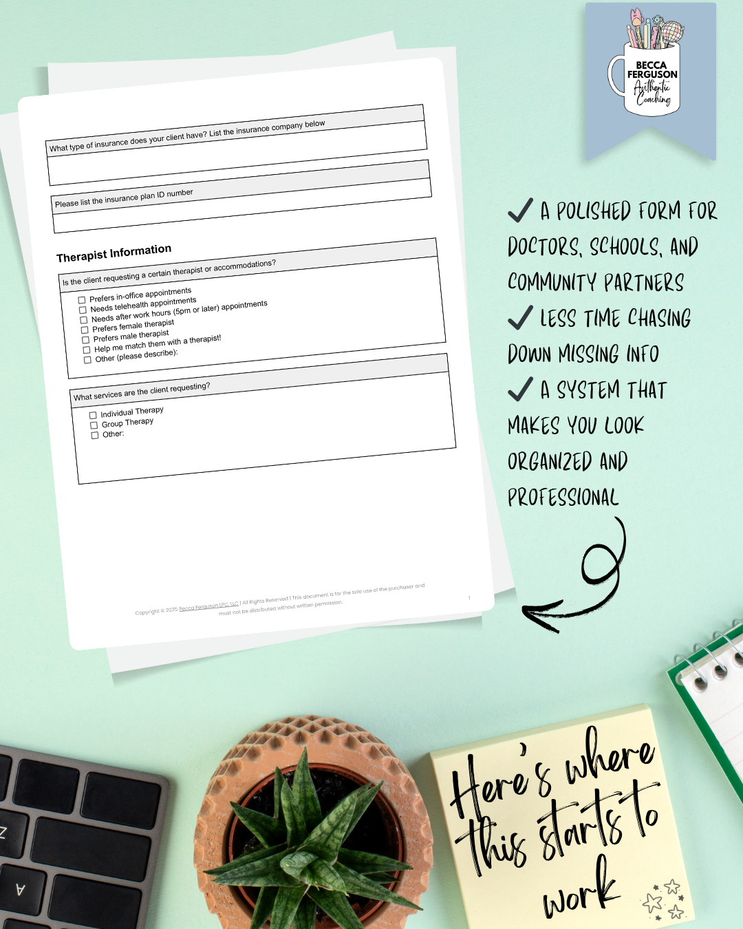 Keep your practice organized with this ready-to-use PDF template. Whether you need intake forms, client agreements, or referral documents, this template is designed to help you capture essential information with ease. Simply download and print, or upload the PDF to your favorite note-taking app like GoodNotes or ReMarkable to fill it out digitally. No editing required—just grab your pen (or stylus) and get to work right away!