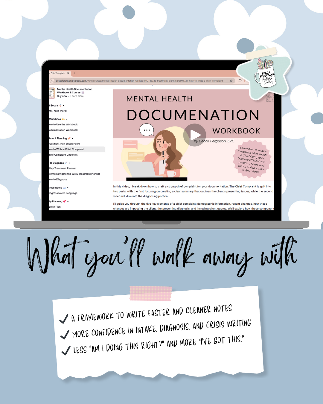 The workbook and course include practical guidance on how to write intake notes, progress notes, treatment plans, crisis documentation, and more. The course breaks down each section step-by-step, offering examples and tips to make the documentation process easier.