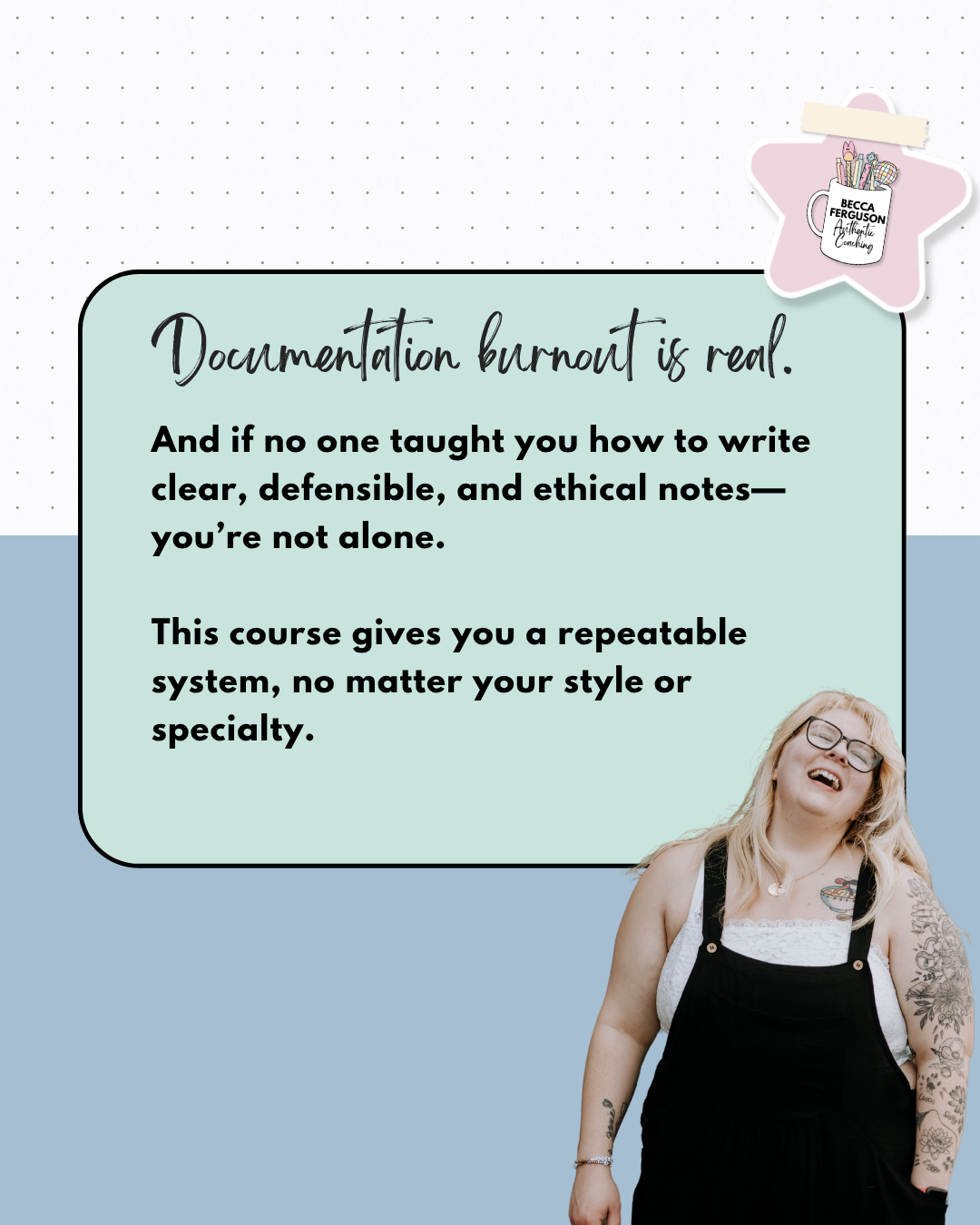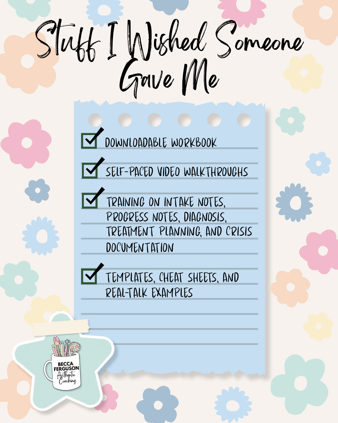 This course is your go-to guide for simplifying the documentation process. I'll walk you through everything from treatment planning and progress notes to safety plans—breaking it all down in a way that makes sense. Whether you're new to therapy or just want to make your notes more efficient, this workbook and course will help you keep things professional and client-focused.