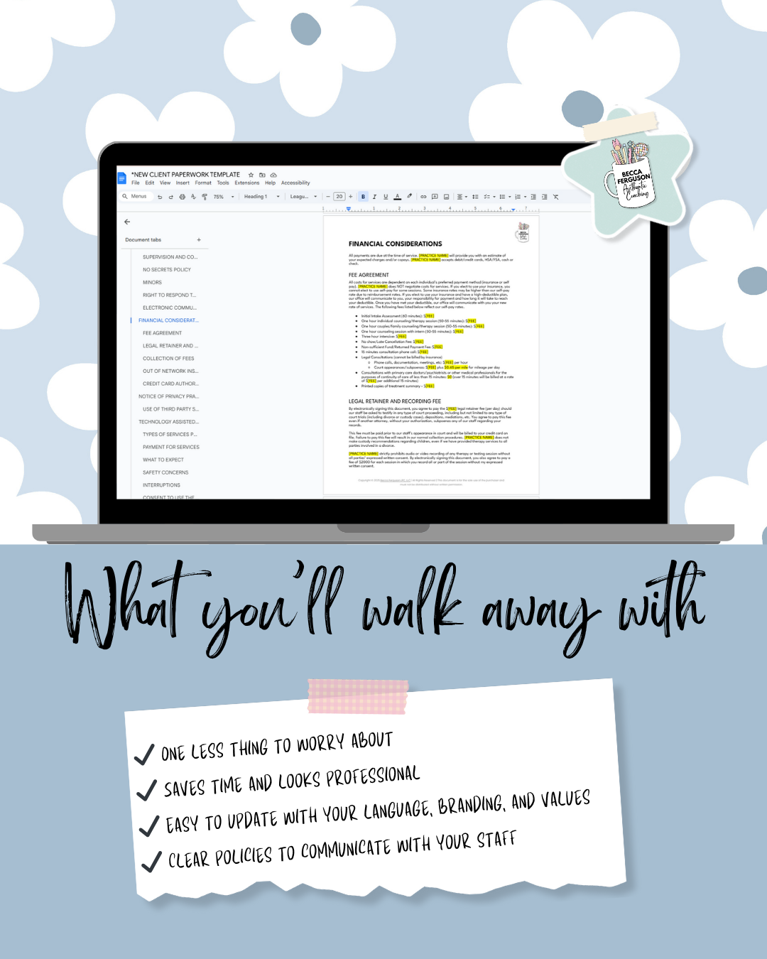 This fully editable bundle gives you the core paperwork every therapist must have before starting services. Skip the patchwork of half-baked consent forms and confusing templates—this Google Doc contains all the must-have sections in one place: