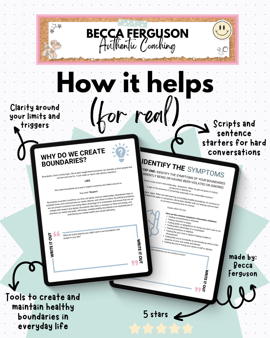 Boundaries are essential for maintaining mental wellness and creating relationships that honor your needs and desires. In this workbook, we’re going to break it down into five clear steps that will guide you to a place of self-respect and clarity. ✨