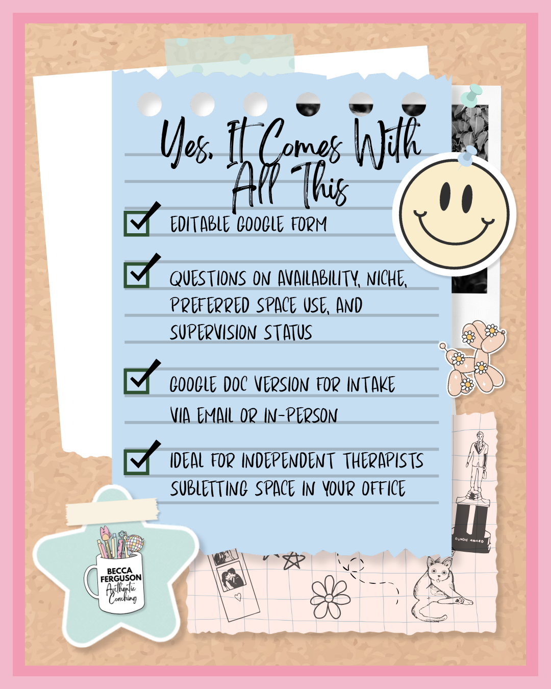 Each course or template comes with the tools you actually need—no fluff, no filler. Below, you’ll find a visual preview of what’s included, from workbooks and guided journals to forms, templates, and videos. Click any image to zoom in or get a closer look before you download.