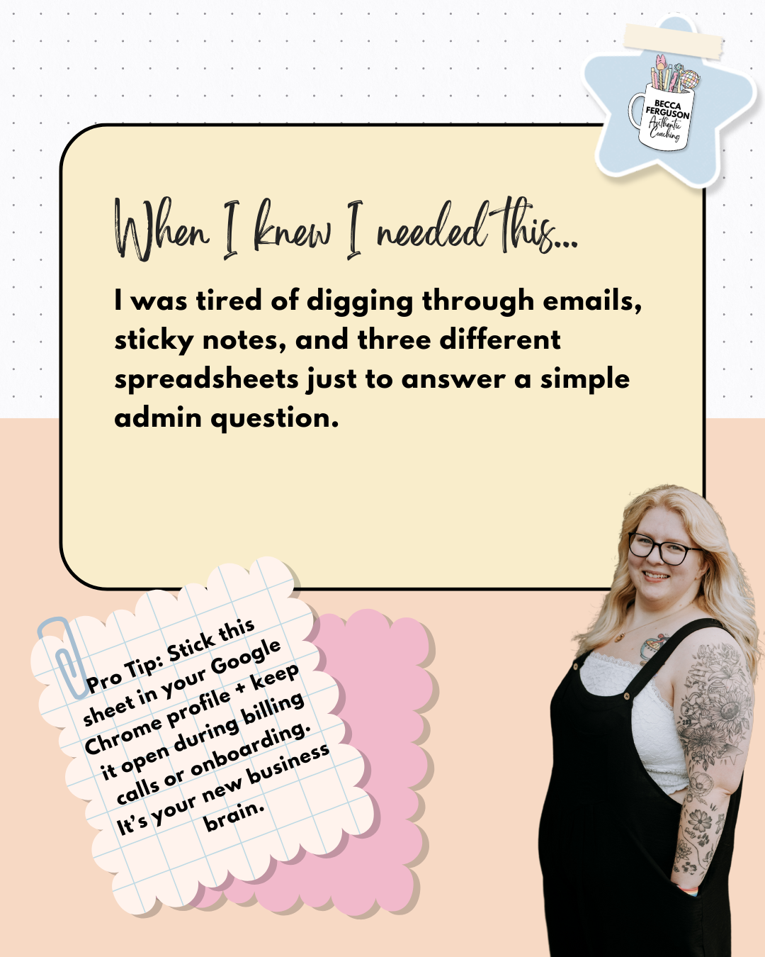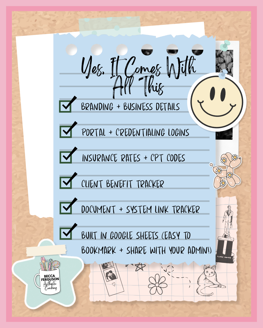 You’re officially one step closer to getting your stuff together. Whether you’re just getting started or wrangling years of scattered info, this editable Google Sheet was built to help you organize the backend of your practice—without the chaos.